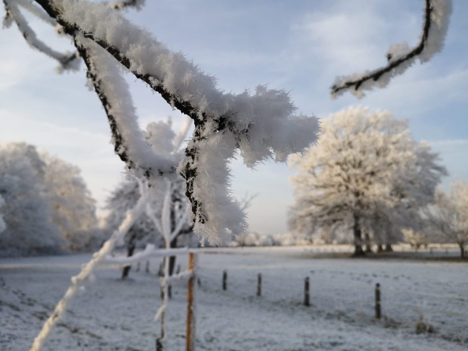 Und doch, so ist es. Die Straße führt an den Wiesen vorbei zu unserem Hof.